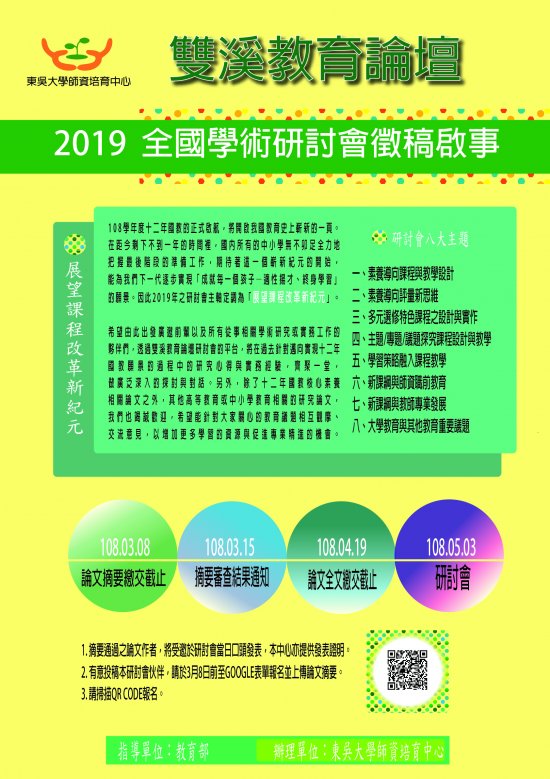 二、有鑑於十二年國教即將於108學年度正式全面啟航,本屆雙溪教育論壇將研討會主軸定位在「展望課程革新的新紀元」,透過雙溪教育論壇研討會的平台,做廣泛深入的探討。其他與大學教育及重要教育相關議題的研究論文,亦竭誠歡迎。