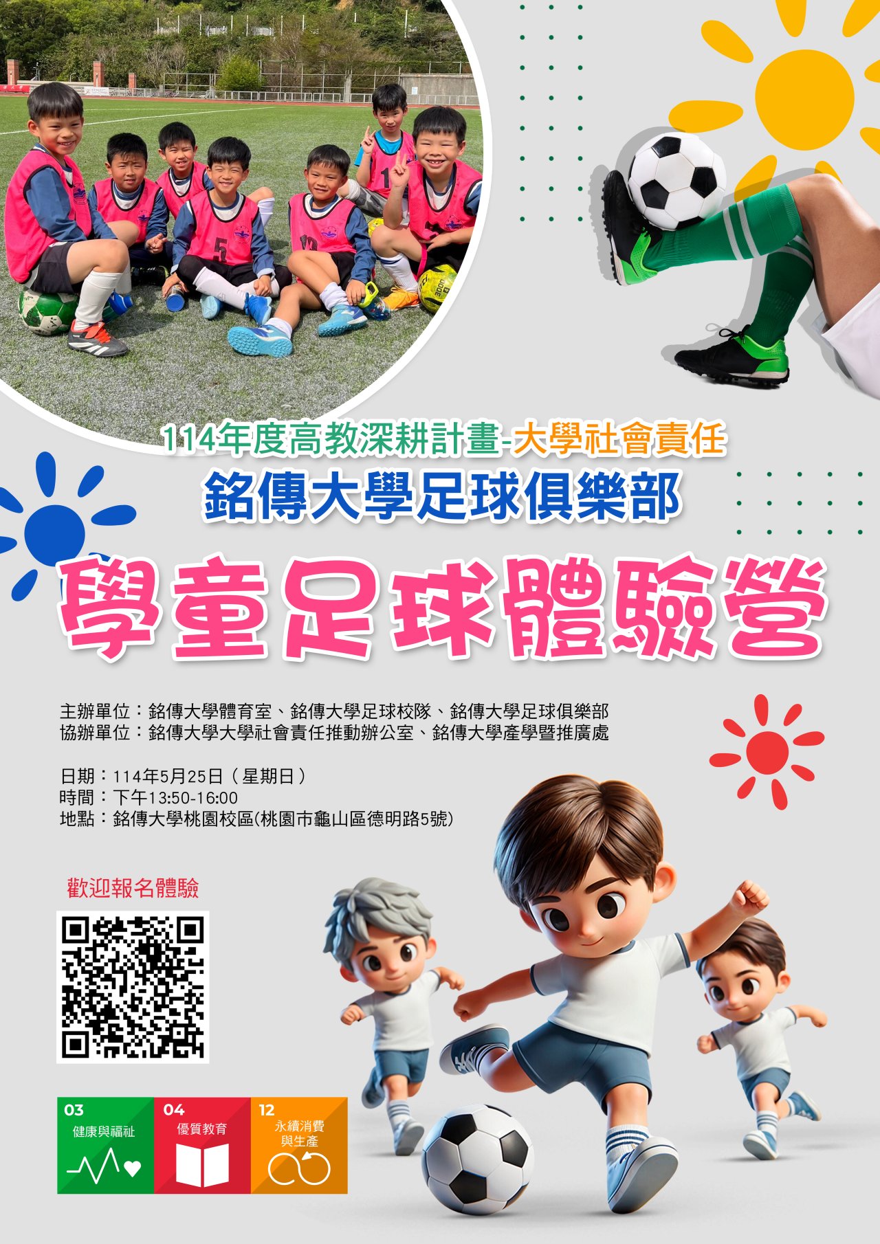 二、 | 本校體育室為善盡大學社會責任(USR)落實在地深耕,奠定基層運動風氣,並藉此達到推展健康社區之目標,擬訂於114年5月25日(星期日)下午13:50-16:00辦理免費足球體驗營,邀請桃園市國中小及幼兒園學童踴躍參加。 |