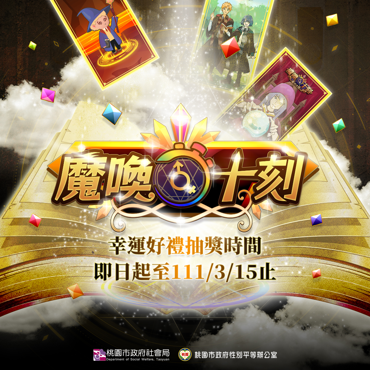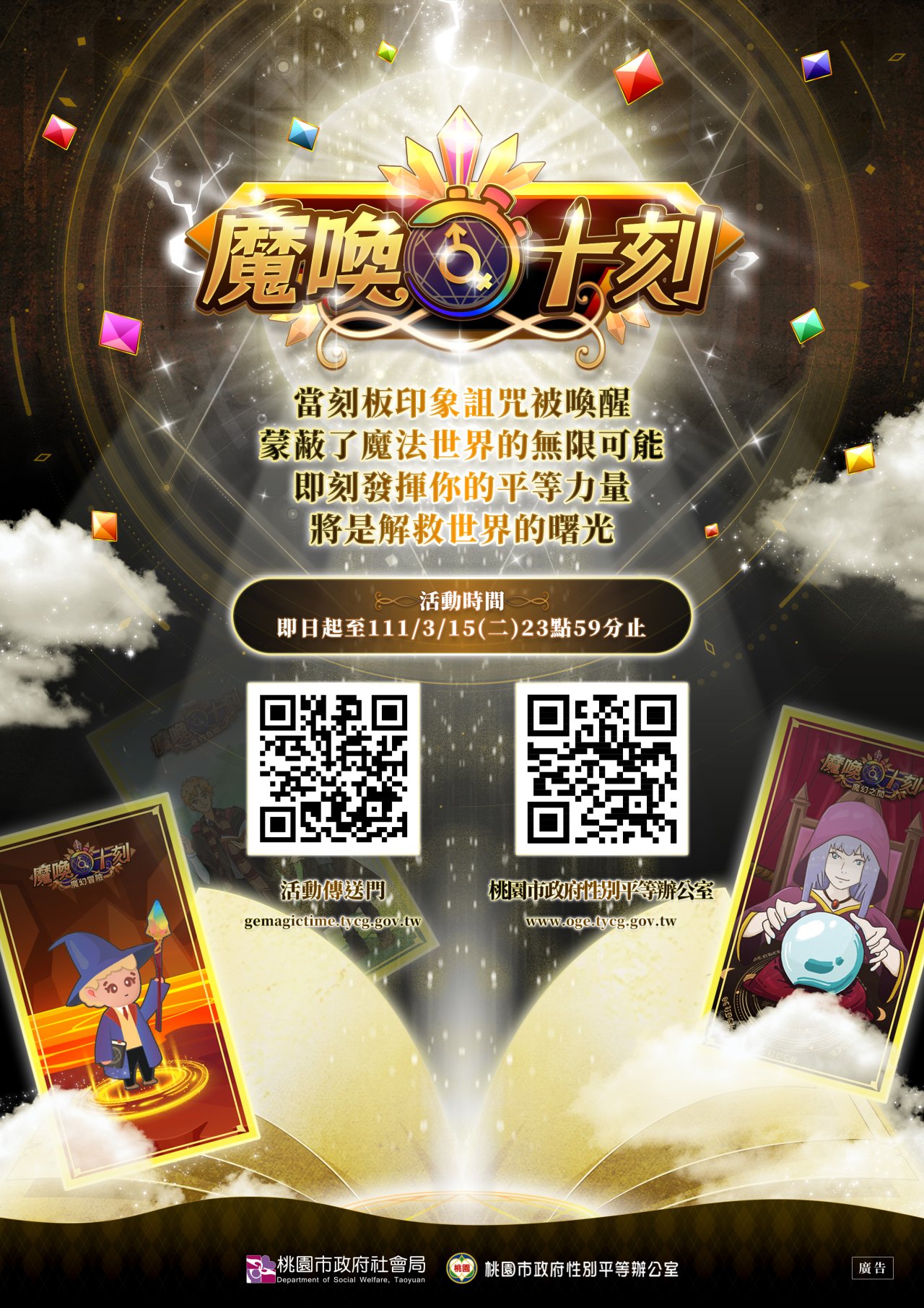 二、 | 為使性別平等教育及宣導不因疫情而中斷,本府於110年以「去除性別刻板印象與偏見」為主題,特別建置性別平等專題式多媒體網站「魔喚十刻」(網址:https://gemagictime.tycg.gov.tw/),結合性平知識與互動遊戲,並邀請學校師生及社會大眾一起輕鬆認識性平。 |