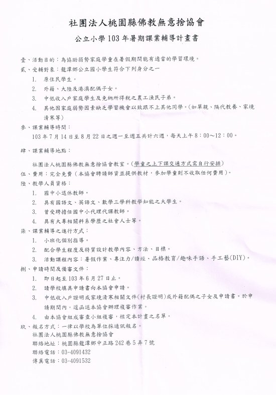 龍潭無意捨協會暑期課業輔導實施計畫