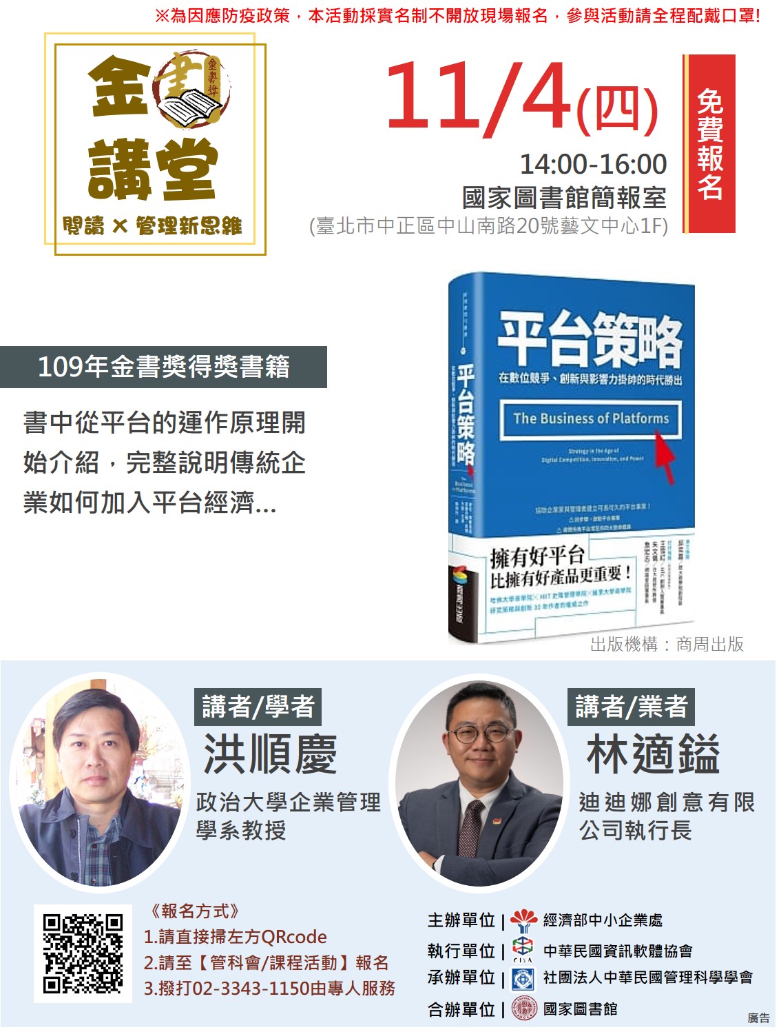另,國家圖書館於11月4日(星期四)下午2時,與經濟部中小企業處及中華民國管理科學學會假本館1樓簡報室舉辦金書講堂:「平台策略:在數位競爭、創新與影響力掛帥的時代勝出」專題演講(如附件2),亦歡迎轉知所屬踴躍報名參加,報名網址: