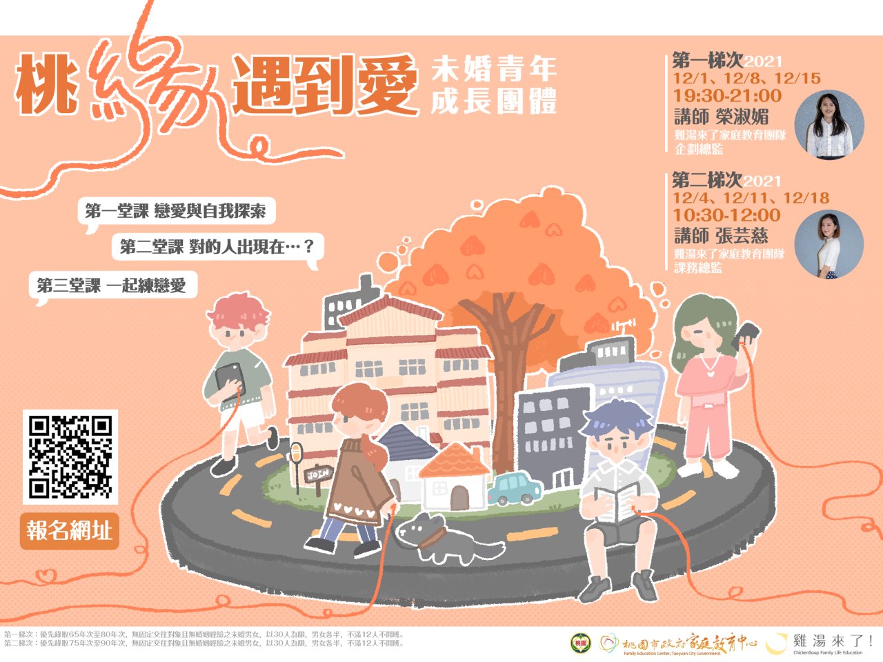 桃園市政府家庭教育中心辦理之110年度桃「緣」遇到愛-未婚青年成長團體簡章1份,請踴躍報名參加