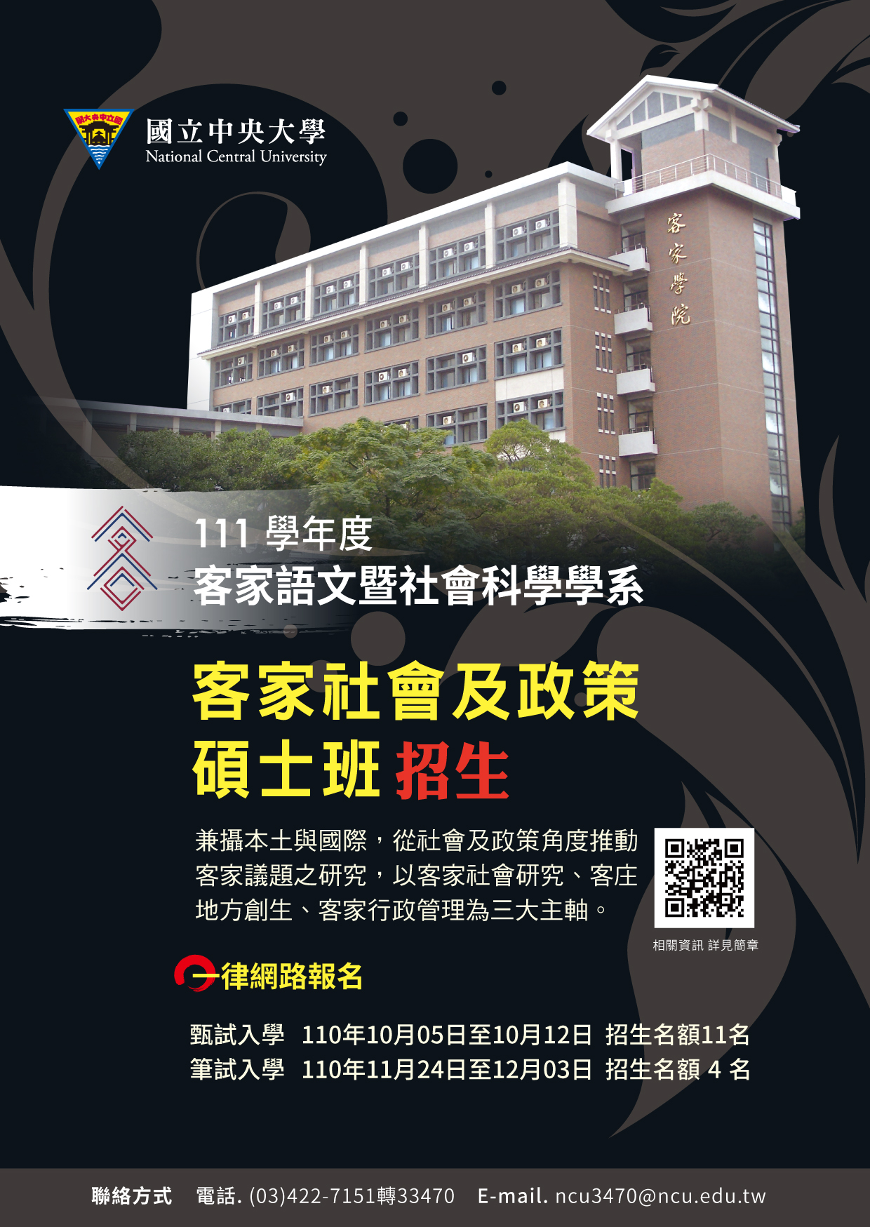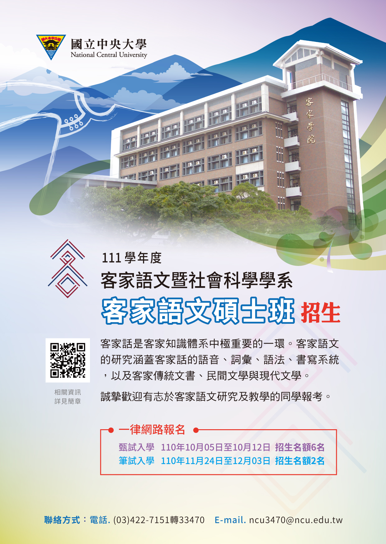 轉知國立中央大學客家語文暨社會科學學系「客家社會及政策碩士班」、「客家語文碩士班」111學年度招生訊息
