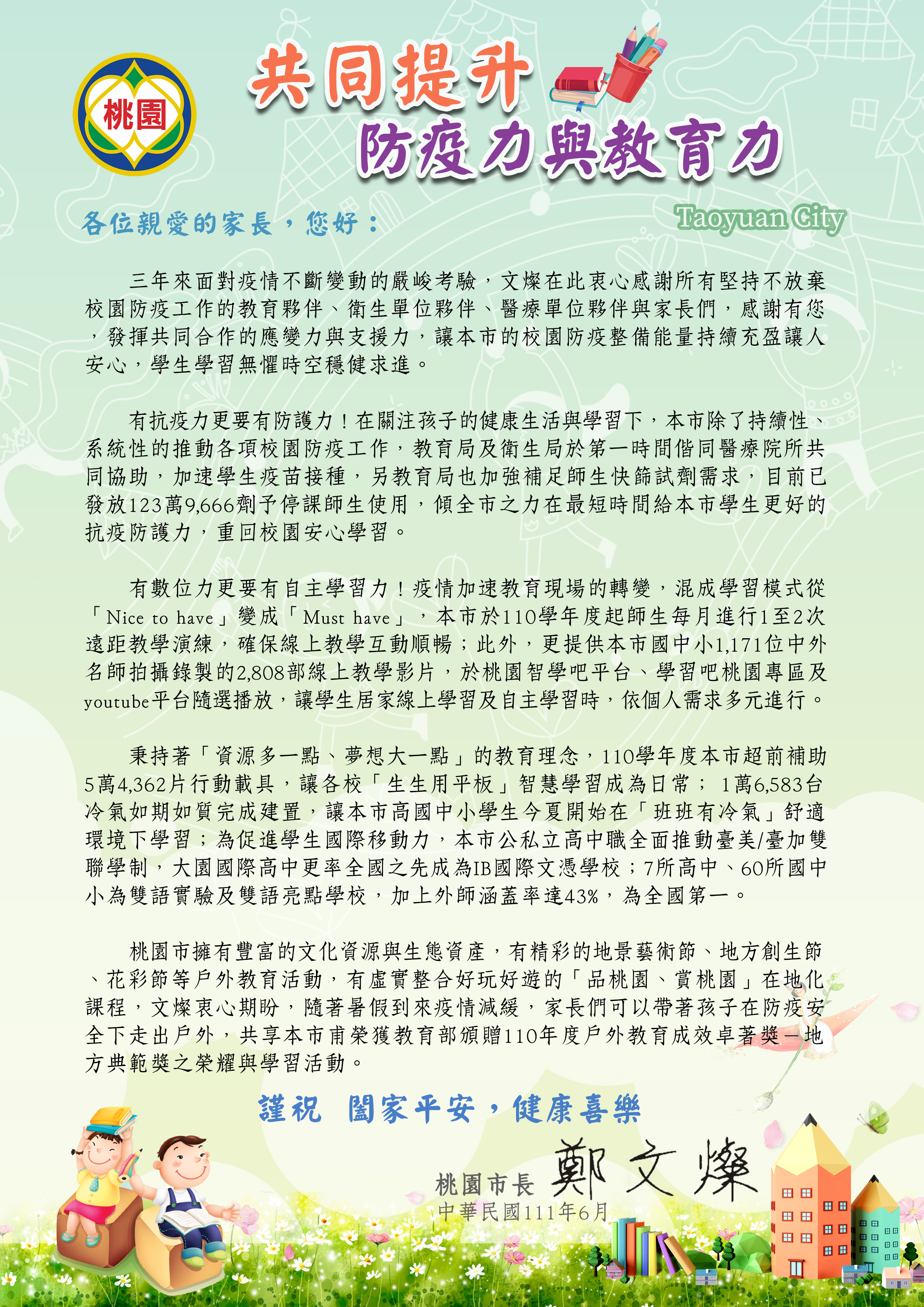 本市110學年度暑假「市長給全市高國中小學生家長的一封信」
