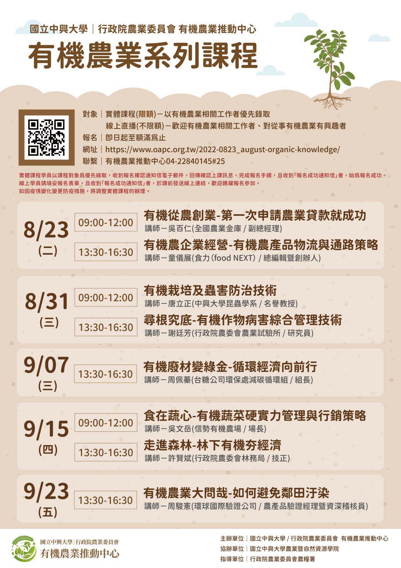 | (三) | 報名方式:統一網路報名,實體課程名額有限,額滿為止;線上同步不限額(報名網址:https://www.oapc.org.tw/2022-0823_august-organic-knowledge/)。 |