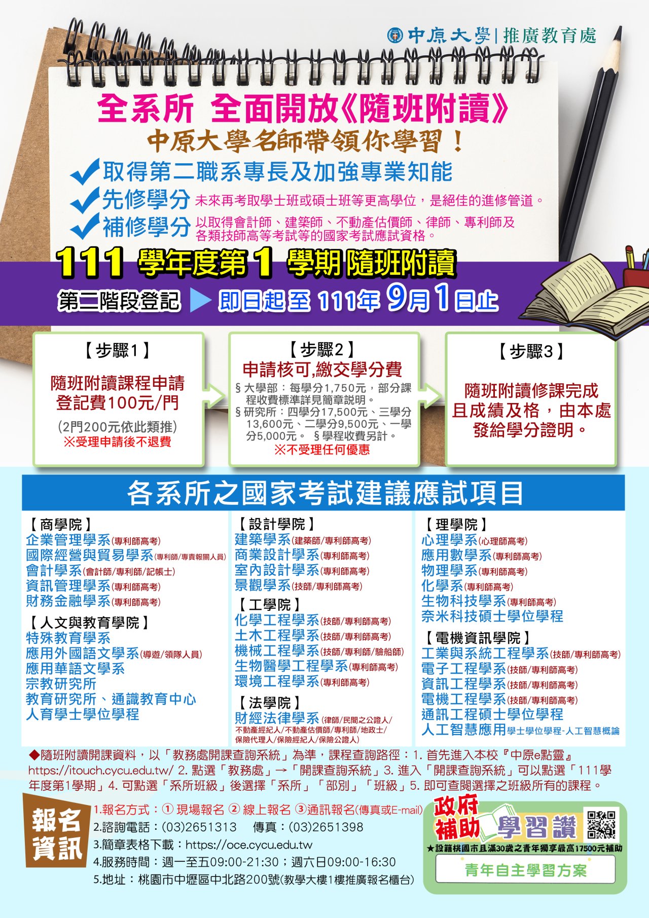 一、本校全系所全面開放111學年度第1學期隨班附讀,選讀登記報名自即日起至111年9月1日止。