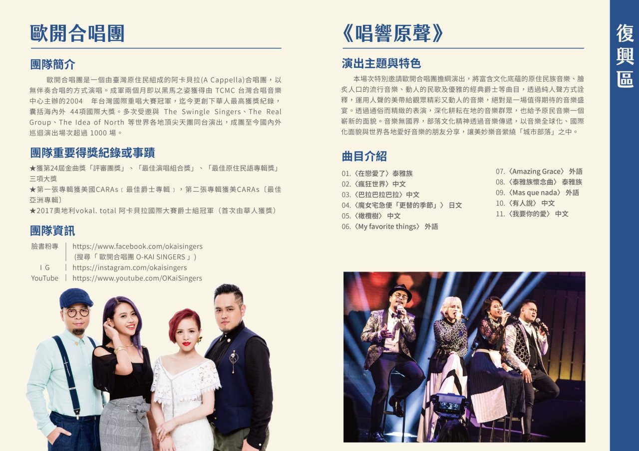 本場次特別邀請歐開合唱團擔綱演出,將富含文化底蘊的原住民族音樂、膾炙人口的流行音樂、動人的民歌及優雅的經典爵士等曲目,透過純人聲方式詮釋,運用人聲的美帶給觀眾精彩又動人的音樂,絕對是一場值得期待的音樂盛宴。透過通俗而精緻的表演,深化耕耘在地的音樂群眾,也給予原民音樂一個嶄新的面貌。音樂無國界,部落文化精神透過音樂傳遞,以音樂全球化、國際化面貌與世界各地愛好音樂的朋友分享,讓美妙樂音縈繞「城市部落」之中。