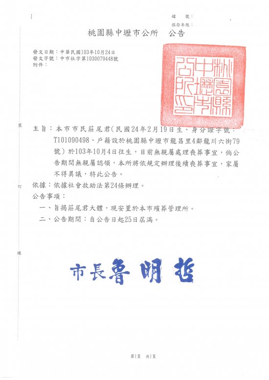 有關中壢市市民莊尾君死亡公告乙份,協尋家屬認領。