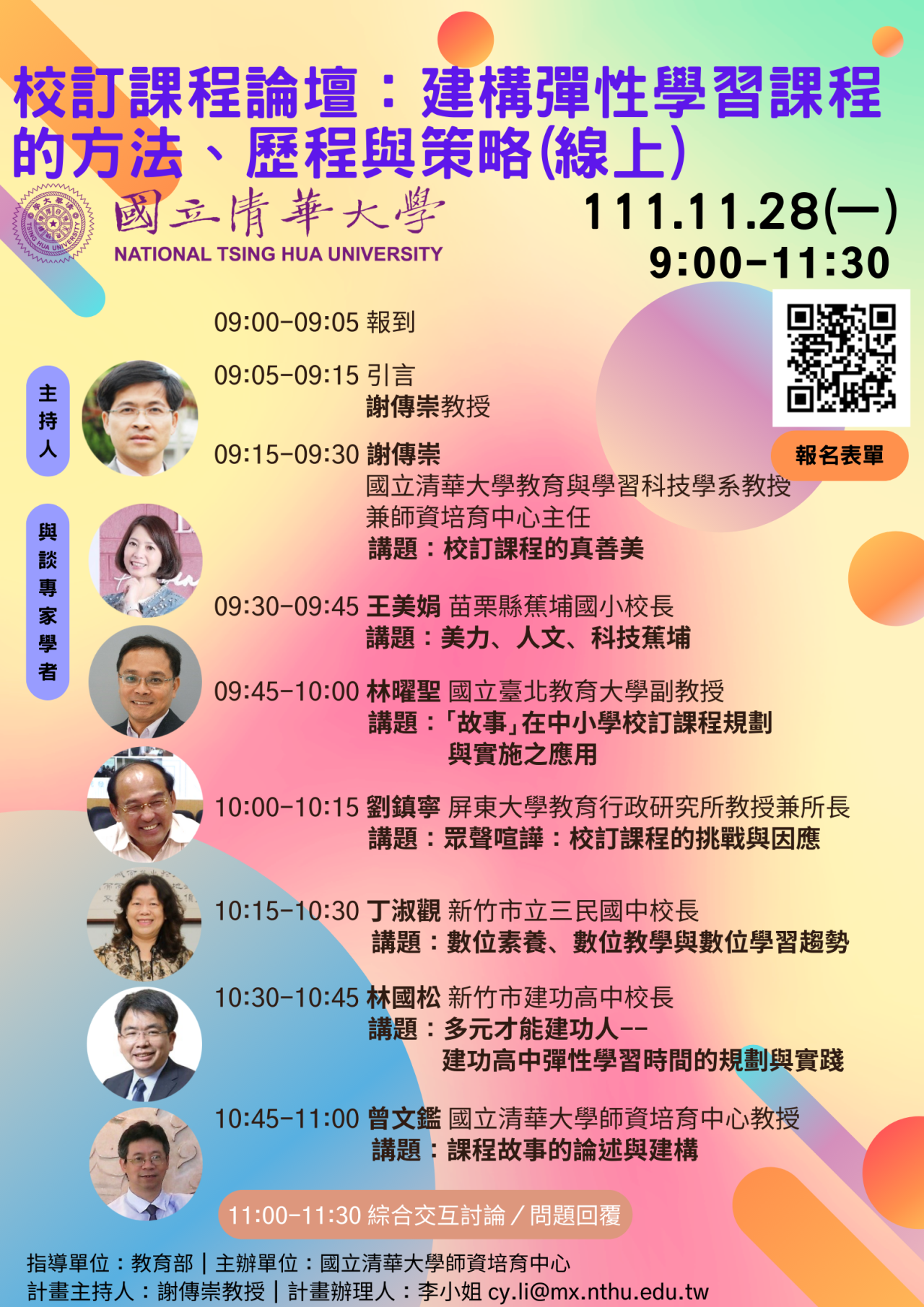揭線上論壇以「校訂課程:建構彈性學習課程的方法、歷程與策略」為主題,藉由專家學者,探索教育理論與實務,以能力取向、社群與批判思維深度鑽研教學知能,厚實自我生命資歷,與自我深度對話、追求卓越,成就未來的優質教育家與終身學習者。