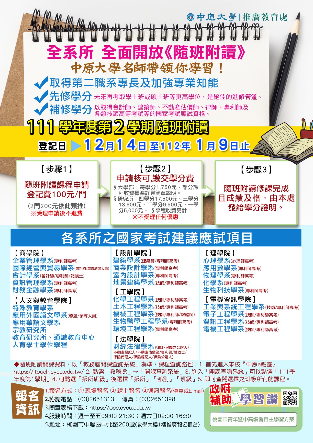 一、本校全系所全面開放111學年度第2學期隨班附讀,第一階段選讀登記報名自即日起至112年1月9日止。