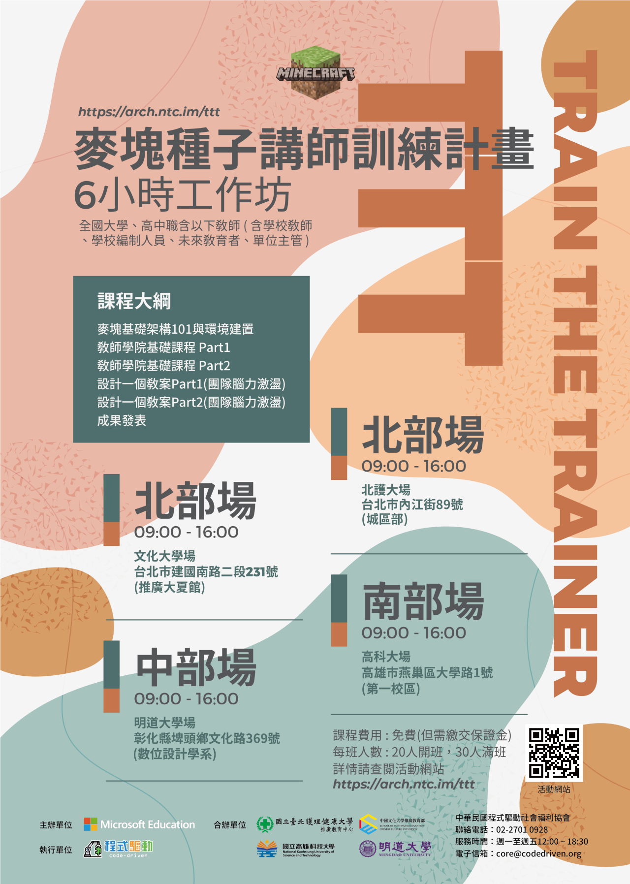 | 五、 | 免學費但須事先繳交保證金。凡完成研習之教師,皆可獲得麥塊種子講師訓練專屬紀念T-shirt一件與研習紀念貼紙一份等。 |