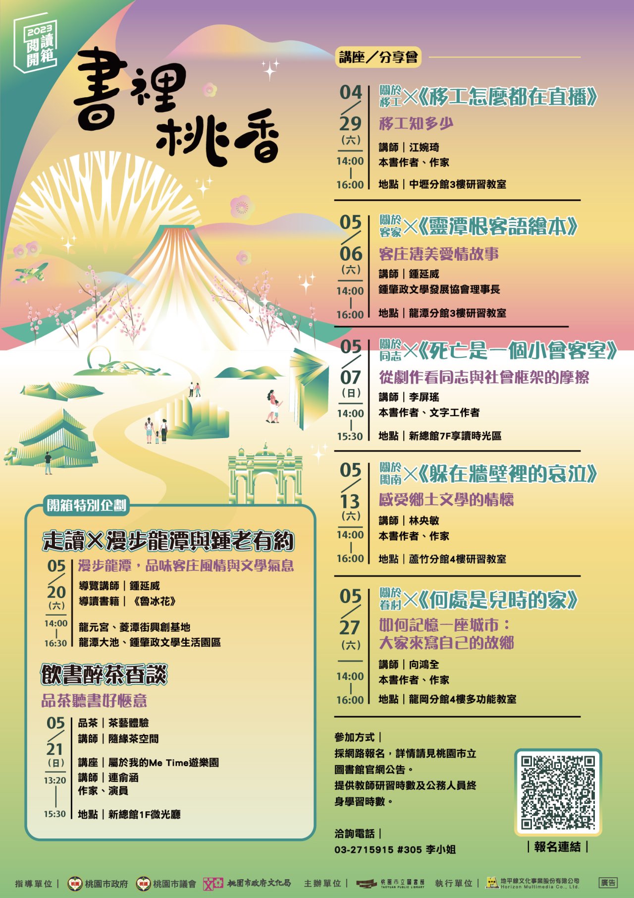 「2023桃園閱讀開箱:書裡桃香第一季活動」於112年4月29日至5月27日辦理,場次如下: