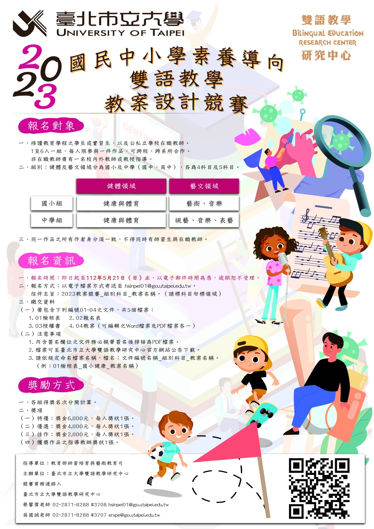 如有相關問題請逕洽臺北市立大學雙語教學研究中心蔡馨霈教師,聯絡方式:(02)2871-8288#3708 或電子信箱: