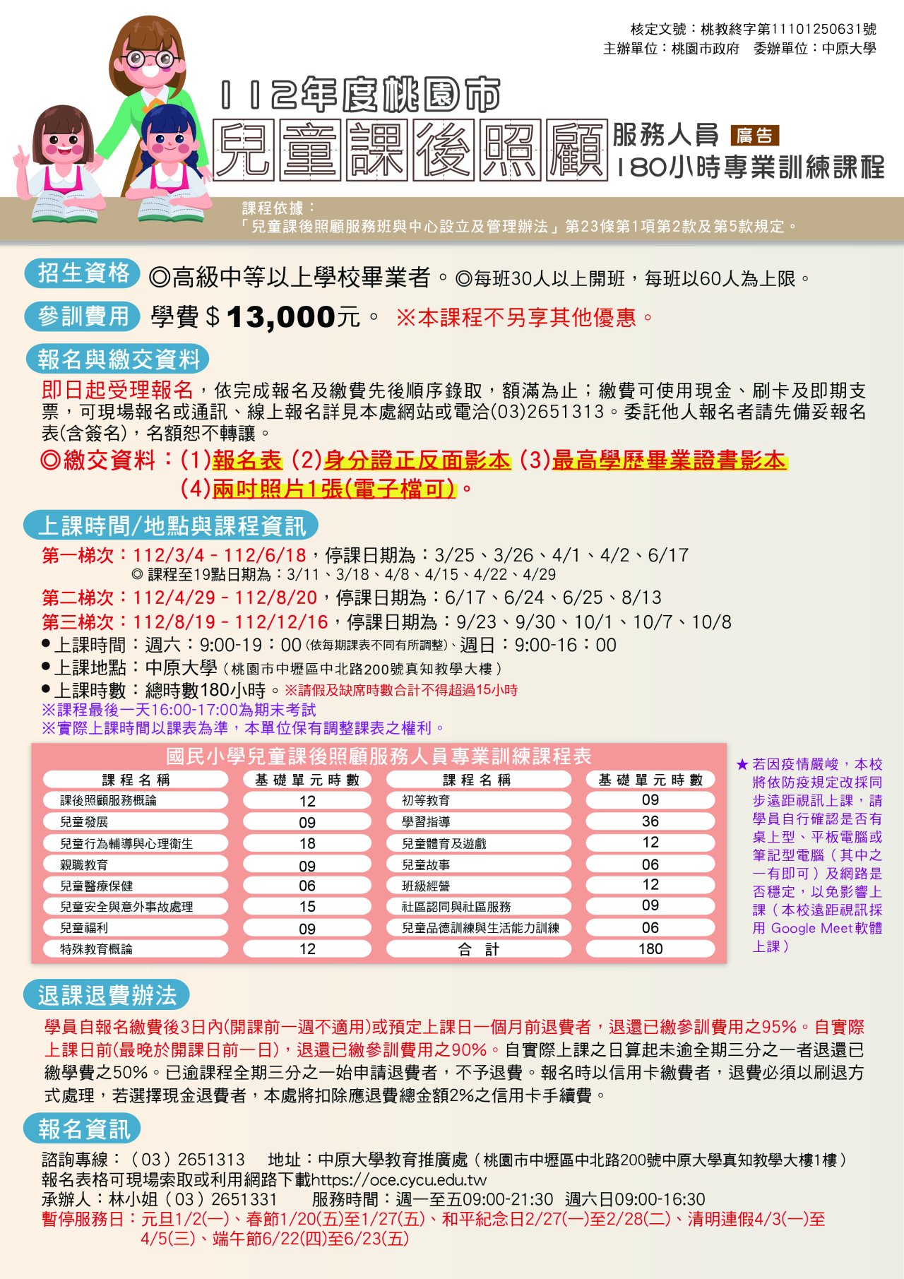 轉知中原大學辦理「桃園市112年度兒童課後照顧服務人員180 小時專業訓練課程」簡章及報名表各1份