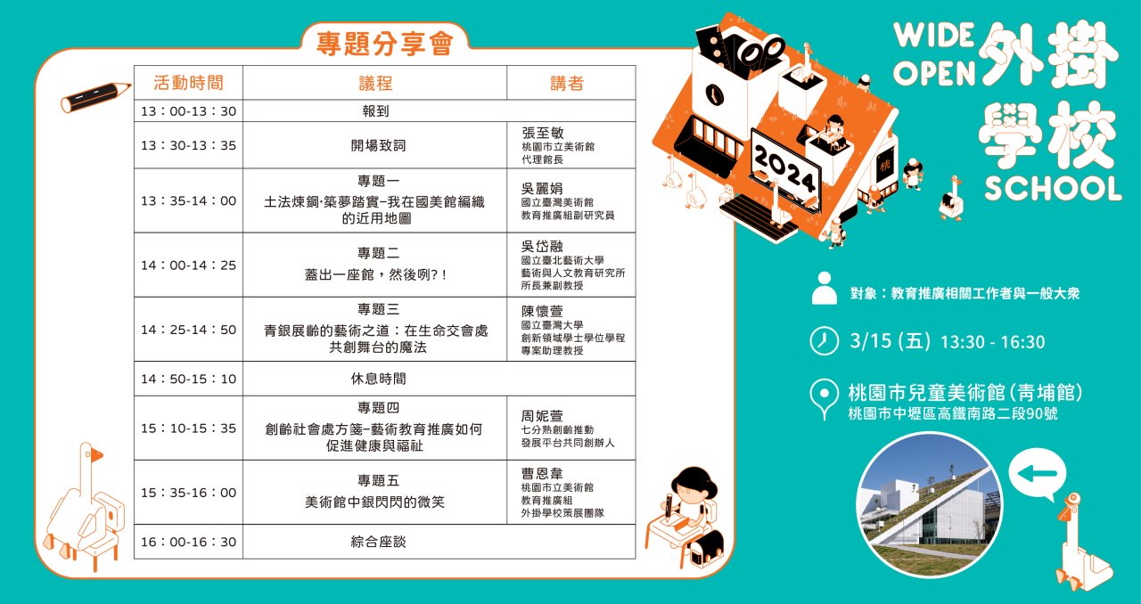 | (二) | 地點:桃園市兒童美術館青埔館1F國際演講廳(320桃園市中壢區高鐵南路二段90號) |