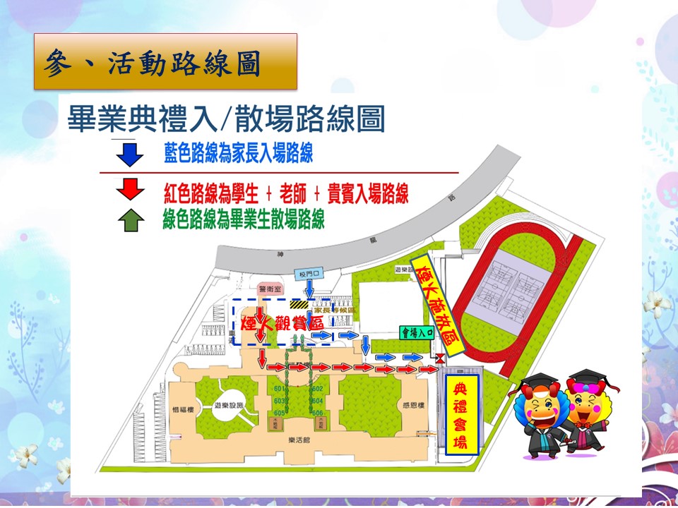 1.本校畢業典禮流程、場地及路線圖如附件.
