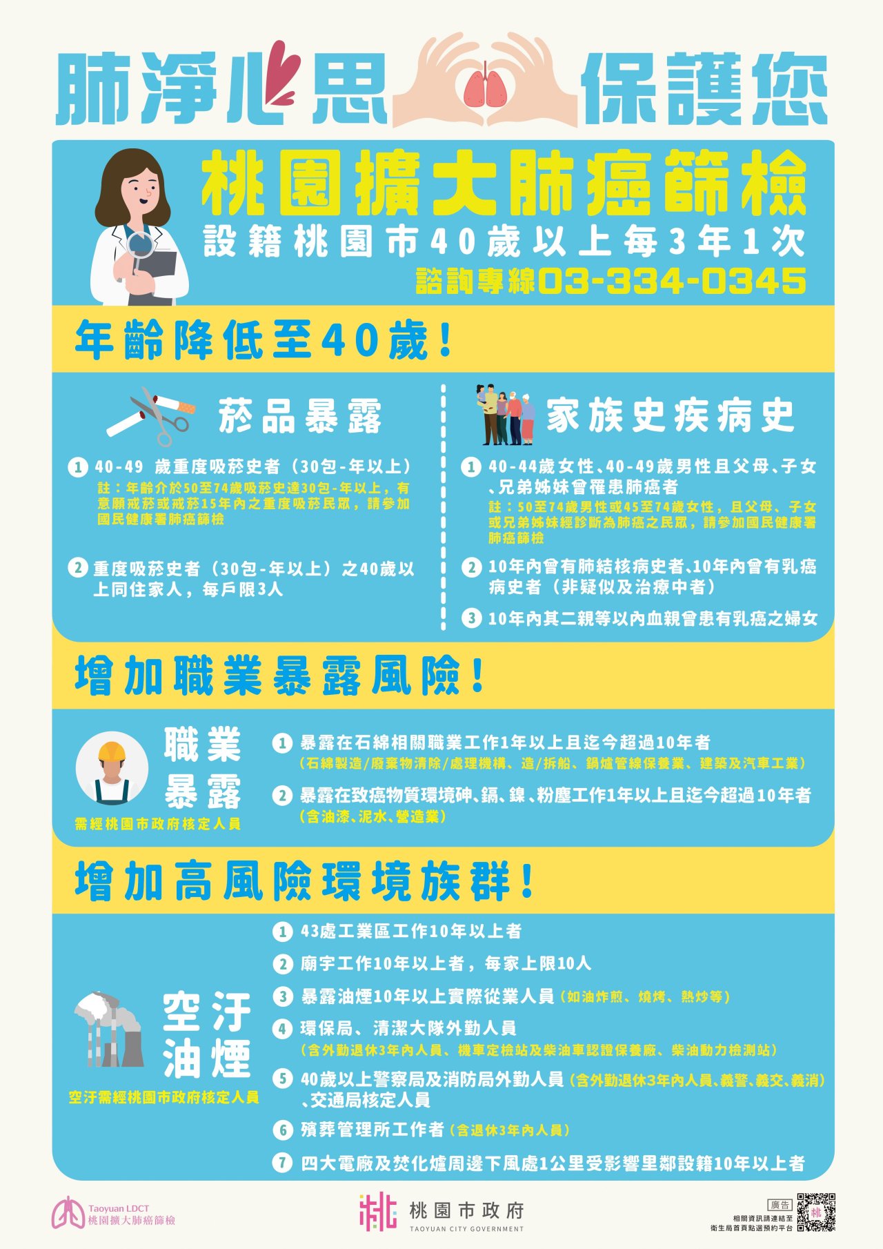 | 二、 | 肺癌為桃園市癌症死亡率第1位,而低劑量電腦斷層(LDCT)檢查,是目前唯一具國際實證可早期發現肺癌的篩檢工具,本市自112年3月1日起結合17家醫院推動旨揭計畫,補助設籍桃園市,40歲以上具「菸品暴露」、「相關疾病史及家族史」、「職業暴露」及「空汙及油煙」等4大類高風險族LDCT肺癌篩檢,以早期發現與治療,降低肺癌死亡率。 |