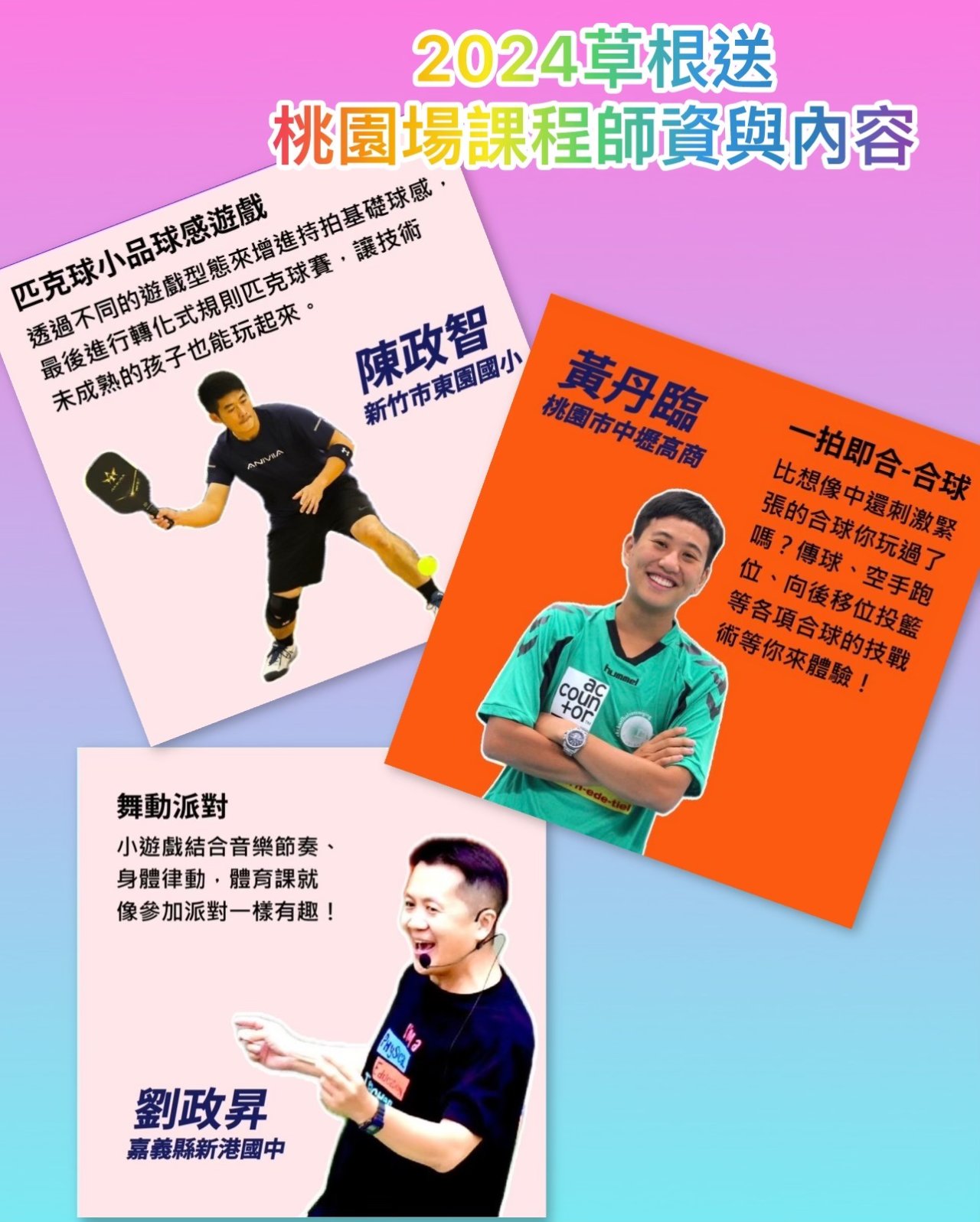| 四、 | 課程內容與師資:第一堂09:00-10:30舞動派對-嘉義縣新港國中劉政昇老師、第二堂10:50-12:20一拍即合-合球-桃園市中壢高商黃丹臨老師、第三堂14:00-15:30匹克球小品球感遊戲-新竹市東園國小陳政智老師,以上皆為實際操作課程,請著運動服、運動鞋並自備水壺及毛巾。 |