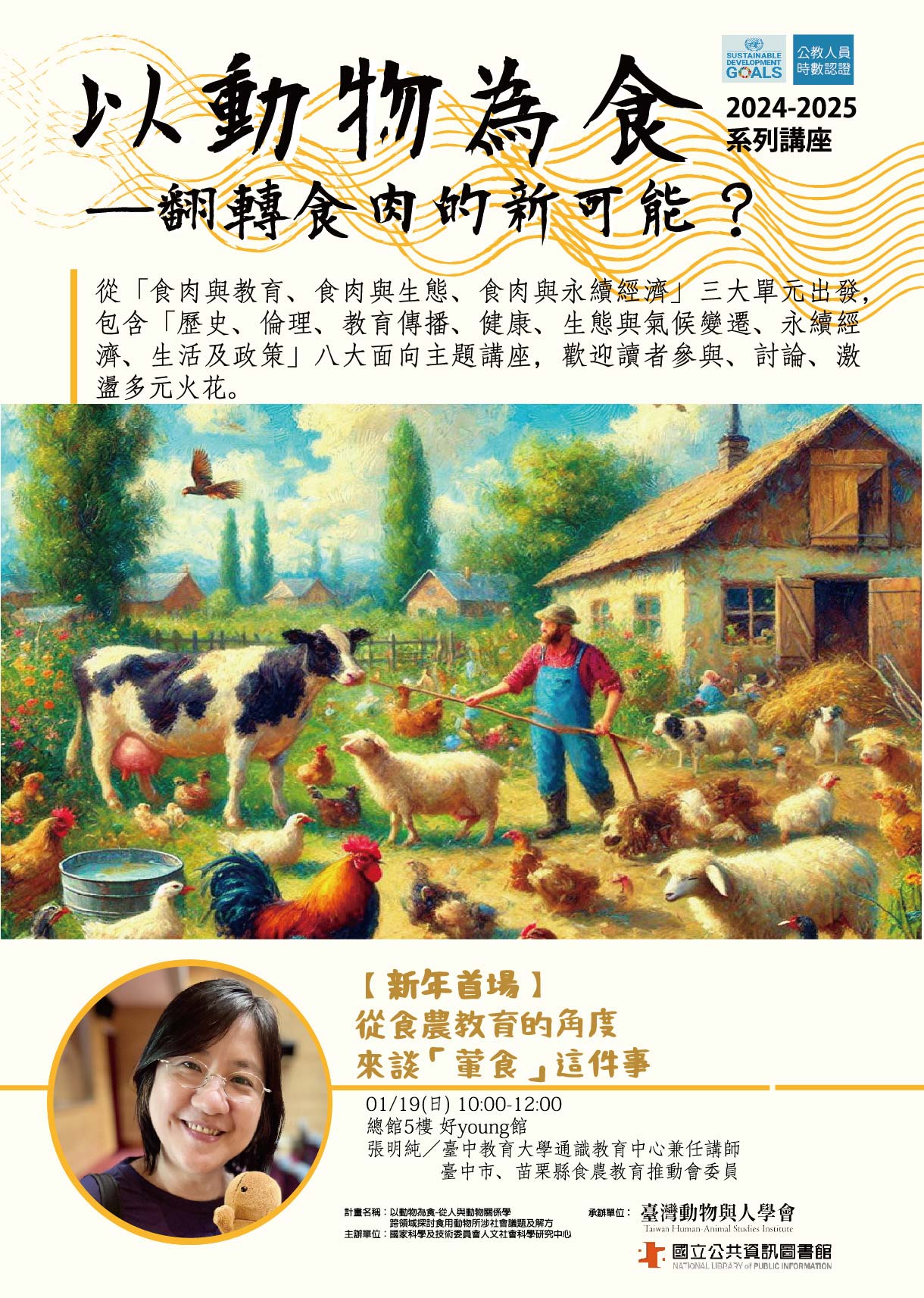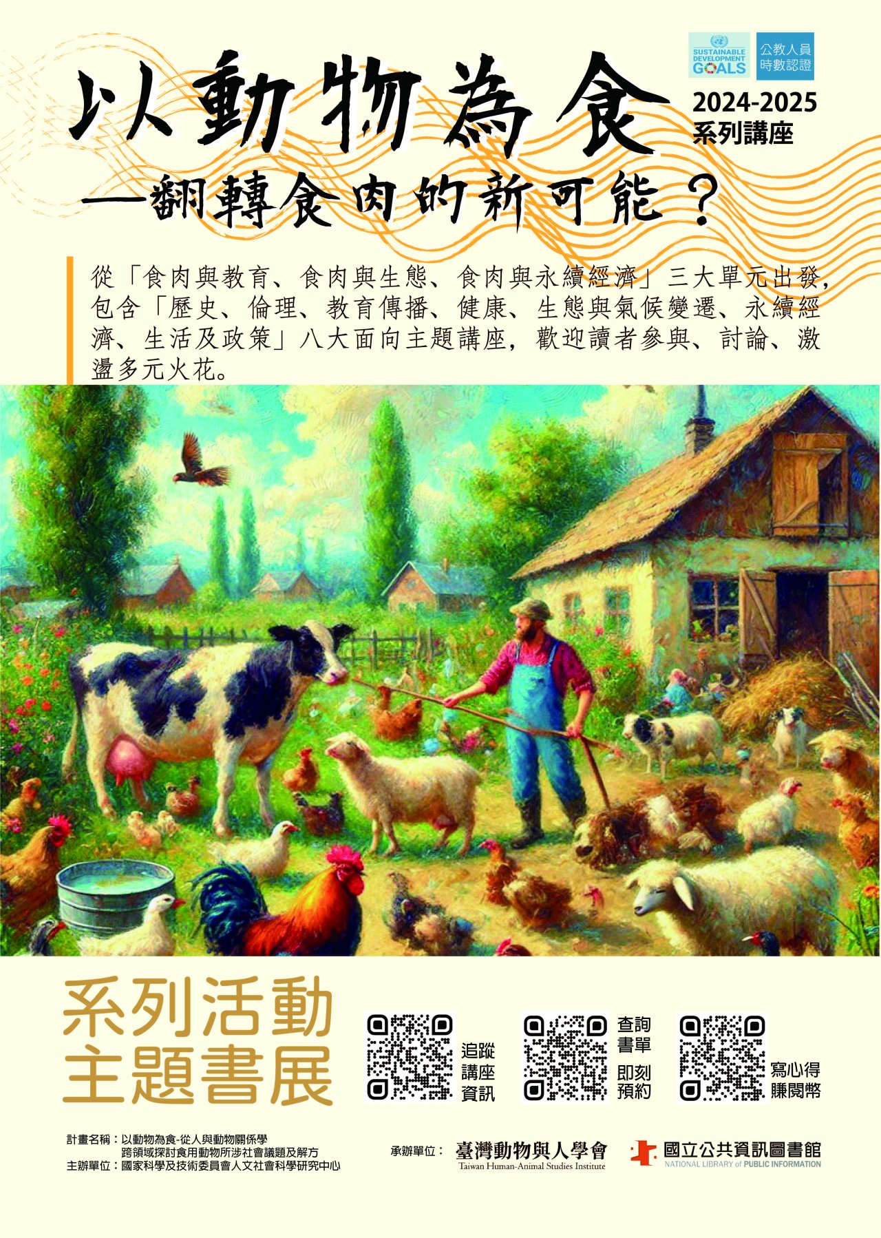 | 二、 | 旨揭活動由國立公共資訊圖書館館與「臺灣動物與人學會」合辦,自113年8月起至114年6月止,就「以動物為食」主題邀請相關領域專家與教育者,與讀者共同參與、討論、激盪多元火花,為自己、家人及大眾未來可能遭遇的生活問題預想因應;系列講座主題包括SDGs、食農、科普等相關內容,採實體講座及線上同步直播方式進行,並搭配線上及實體書展,每場介紹相關書籍。 |