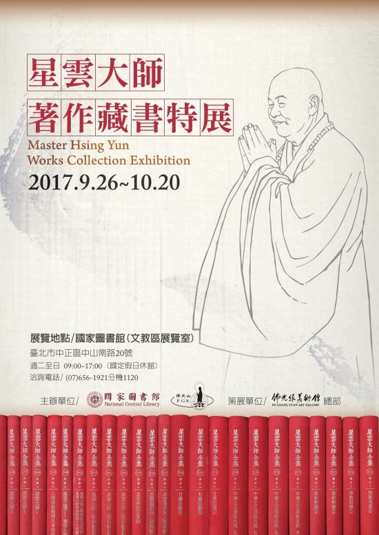 轉知國家圖書館與佛光山文教基金會即日起至10月20日,辦理「星雲大師著作藏書特展」