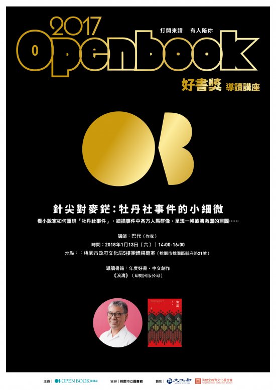 二、由網路媒體OpenBook閱讀誌策辦的2017「OpenBook好書獎」精選出40本年度好書,並於全台辦理9場巡迴講座,桃園場將於107年1月13日(周六)下午2時於桃園市政府文化局五樓團體視聽室舉行由知名作家巴代進行「針尖對麥鋩:牡丹社事件的小細微」講座。