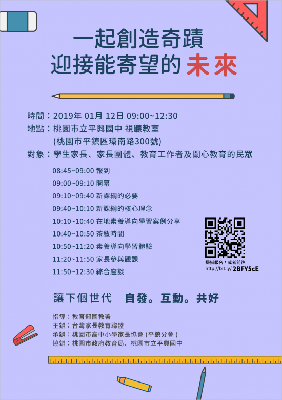 (一)辦理單位:台灣家長教育聯盟主辦、本局協辦、桃園市高中小學家長協會(平鎮分會)承辦。