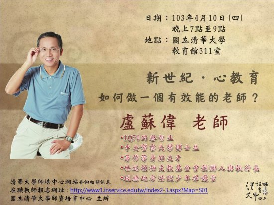 國立清華大學師資培育中心訂於103年4月8日(星期二)及4月10日(星期四)辦理兩場教育主題演講