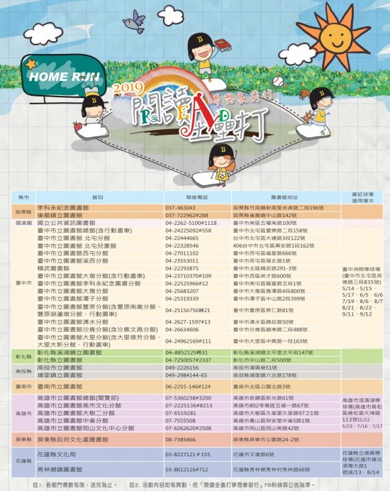 二、旨揭活動為推廣親子共讀,該館與中國信託銀行共同主辦「2019閱讀全壘打夢想象前行」活動,鼓勵學生及家長走進全國30所圖書館閱讀好書,就有機會兌換中信兄弟主場球票與活動代言球星卡貼等獎項。