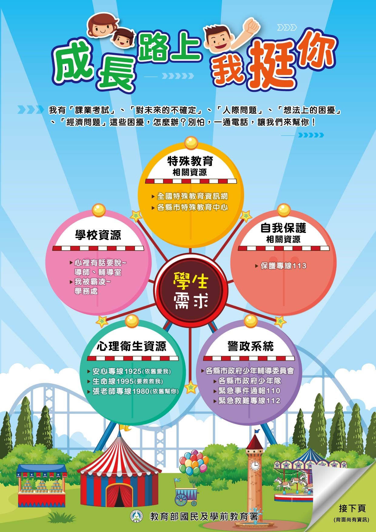 | 四、 | 本宣導單張以透過老師知悉相關資源管道,了解學生及家長需求後,利用課程、活動或班親會說明單張相關資訊,及各級學校可製做成海報張貼或聯絡本封底文宣以提供親職相關資訊。 |